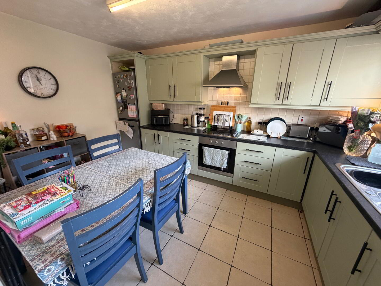 Kitchen/Dining 17'8 x 11'5 Eye and low level units, 1 1/2 bowl stainless steel sink unit with mixer tap, hob, oven and extractor fan, plumbed for washing machine, vented for tumble dryer, understairs storage cupboard, tiled floor.