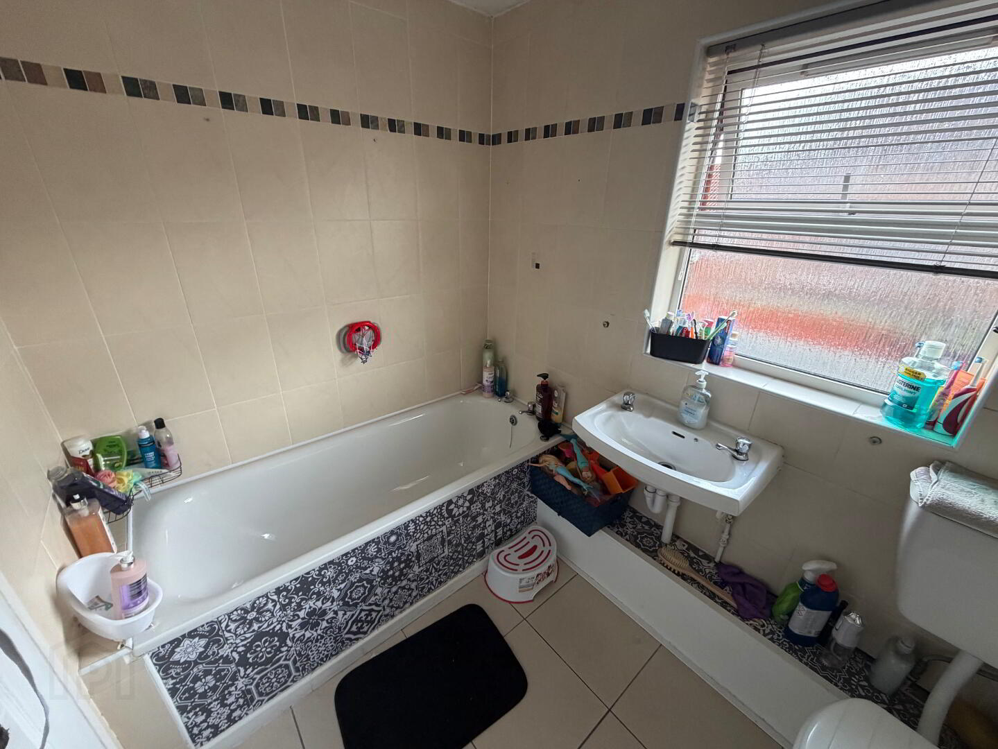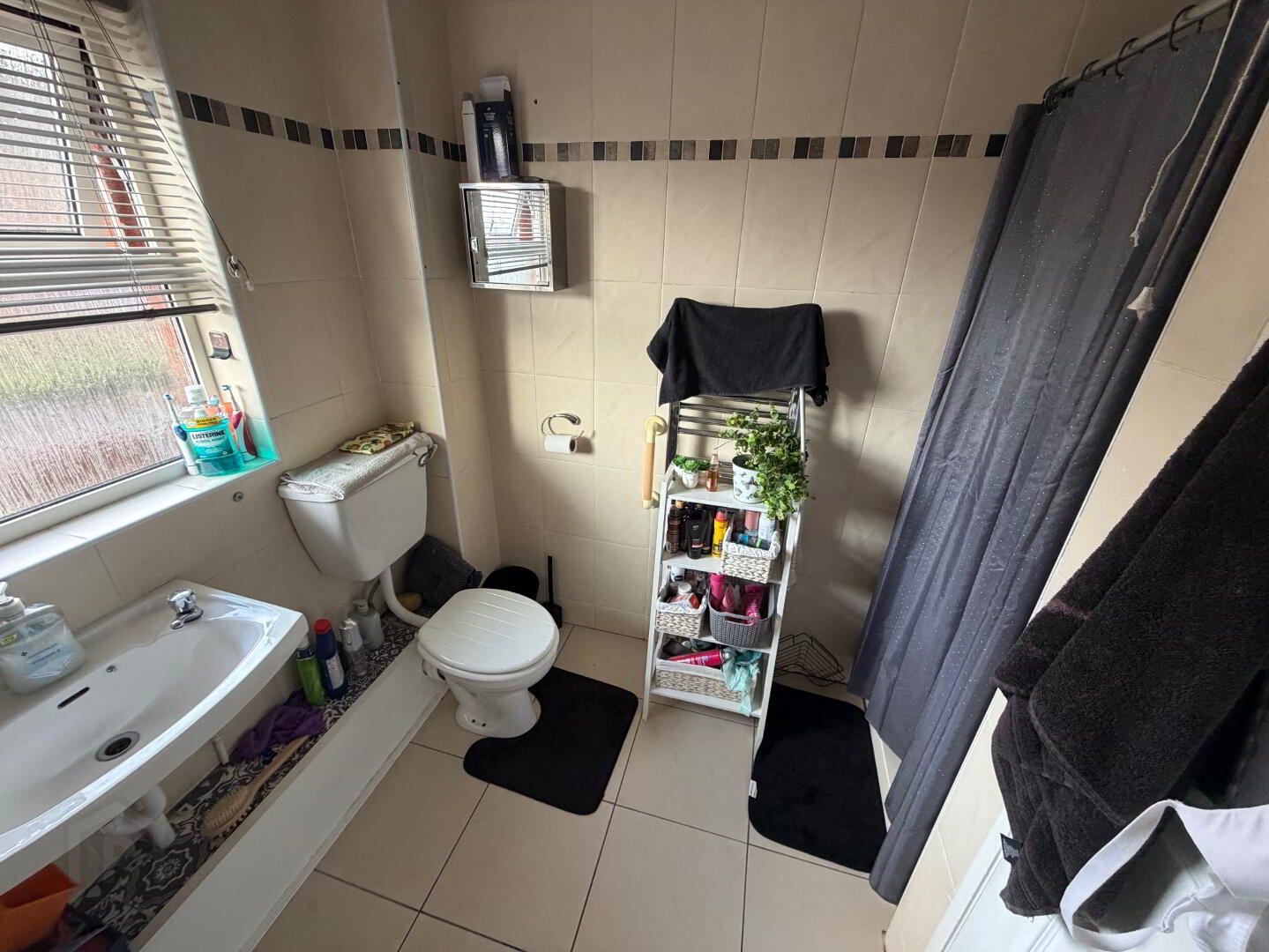 Bathroom Bath with electric shower overhead, wash hand basin and WC, fully tiled walls, tiled floor, heated towel rail.