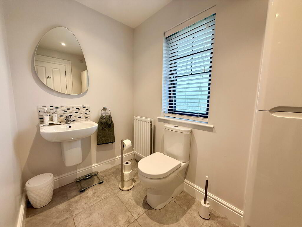 Downstairs WC WC and wash hand basin, partially tiled walls, tiled floor.