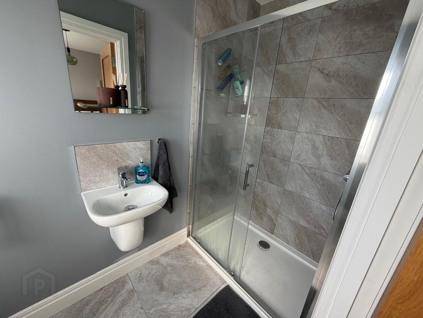 En suite - tiled floor, wc and wash hand basin, fully tiled step in shower